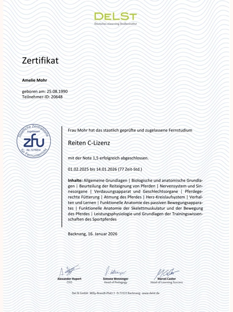 2026 absolvierte ich meine C-Lizenz im Reiten und bestand erfolgreich mein Fernstudium.