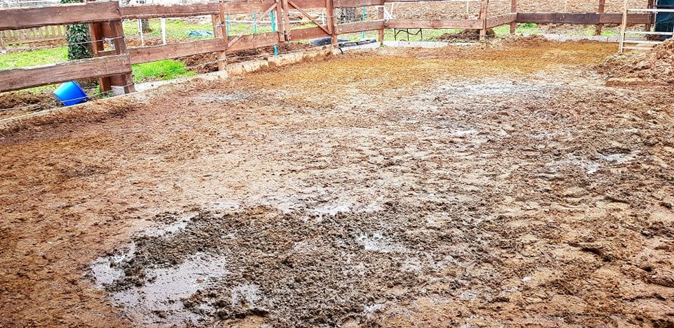 Mitte Februar hörte es dann endlich auf permanent zu regnen. Die Pferde zeigten deutlich, dass es ihnen auch reichte und hielten sich nur im Stall, auf dem kleinen trockenen Paddockstück und unter der Raufe auf. In den Matsch lief keiner freiwillig. Einen ganzen Tag haben wir dann damit verbracht, das gesamte Paddock freizulegen. Der Matsch, in dem man eigentlich keinen Sand mehr erkennen konnte, wurde bis auf die blanke Ridcon Platte herunter gekratzt und wir fuhren die entstandene Komposterde auf einen Haufen abseits des Pferdebereichs.