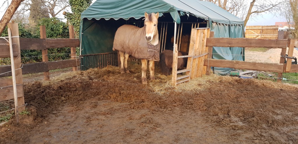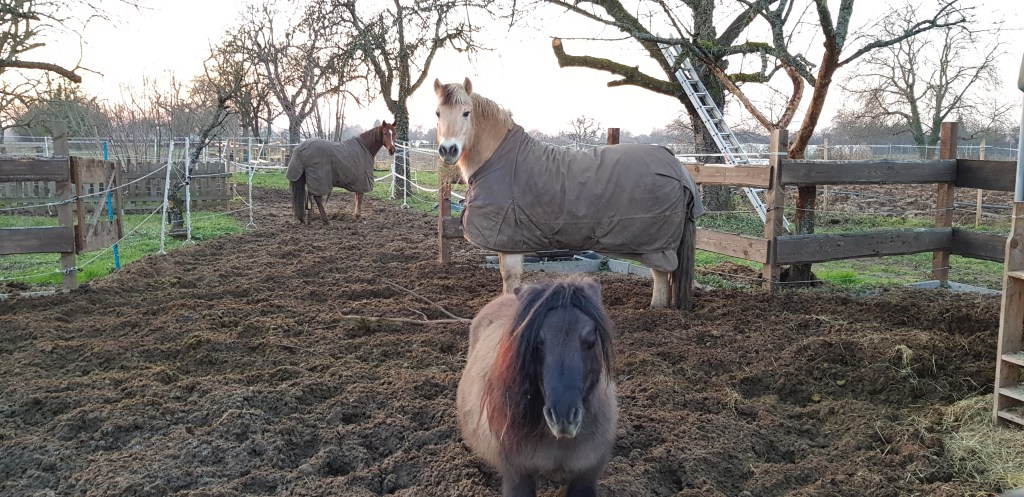 Ich weiß, nach den zwei sehr trockenen Sommern, braucht die Natur das Wasser, aber das war einfach zu viel! Als sich der Dezember dem Ende zuwandte, hoffte ich zumindest auf Bodenfrost oder Schnee. Selbst bei gefrorenem Boden hätte ich noch mehr sauber machen können, als in dem entstehenden Moor. Mein Flehen wurde auch dieses Mal nicht vom Wettergott erhört. Es kam keine Kälte und kein Bodenfrost. Bis Mitte Januar hatte sich eine modernde 30-40cm hohe Morastschicht auf den Ridcon Platten angesammelt. Darunter trat sich die Schicht sogar schon wieder fest und es bildete sich eine Matratze. Die organischen Bestandteile im Sand begannen sich in Kombination mit den Pferdeäpfeln super schnell zu zersetzen. Überall entstanden schwarze Torfablagerungen. Das war zwar eklig, aber wegen der rasanten Zersetzung müffelte die Pampe auch nicht und es war wenigstens nicht so, dass man merkte, dass man da nur noch auf Pferdehaufen läuft.