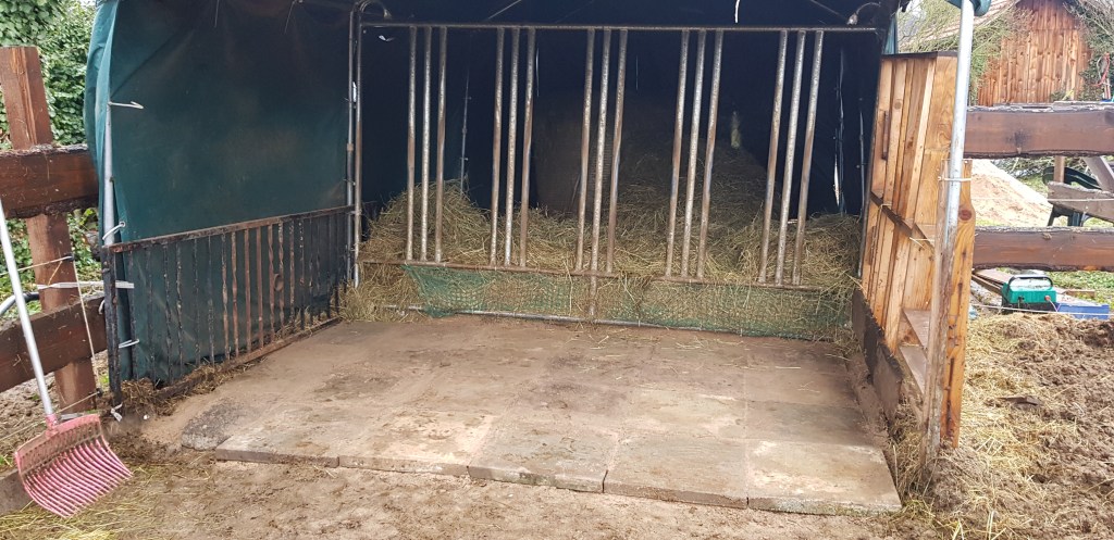 Selbst meine Heustation drohte den Matschmengen zum Opfer zu fallen, weshalb wir die Station im Regen freischaufelten und Betonplatten verlegten, damit man diese abfegen konnte und die kleine Stufe verhinderte, dass der Matsch sich überall breit machte.