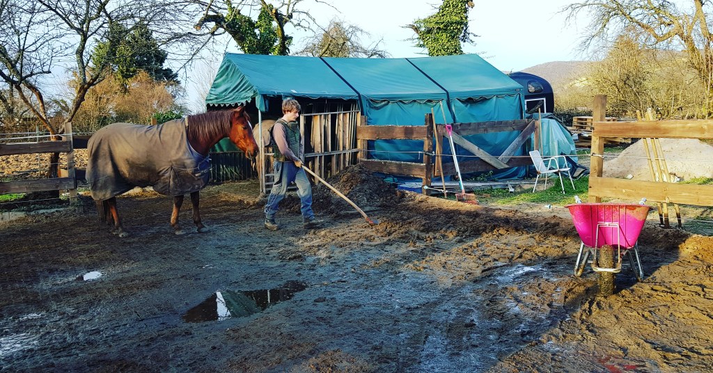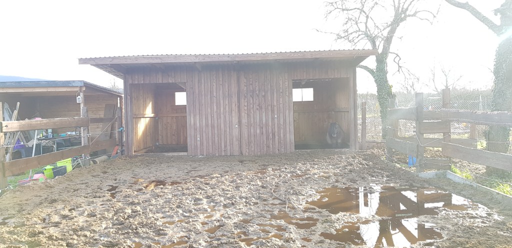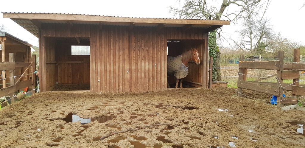 Nach 3 Monaten Dauerregen hörte es Anfang Februar endlich knapp fünf Tage auf zu regnen. Das Paddock konnte zwei Tage abtrocknen und die anderen drei Tage standen wir zu zweit auf dem Paddock und haben ¼ der Fläche freischaufeln können.