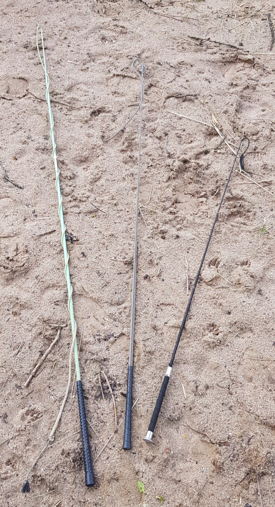 Ihr seht also, dass man mindestens 3 Gerten und Peitschen im Schrank stehen hat. 1x eine Reitgerte, dann eine Bodenarbeitsgerte in lang und eine Longierpeitsche für große Distanzen.
