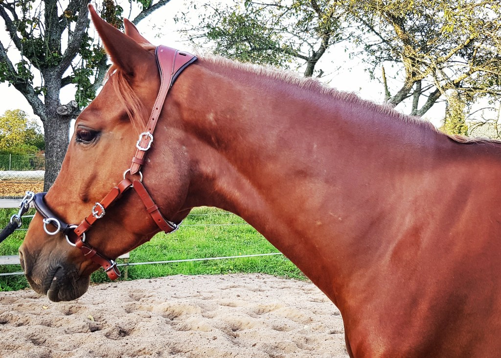 Damit ich mit meinen Pferden auch mal ohne alles reiten kann, besitze ich noch einen über 10 Jahre alten Halsring. Er hat einen harten und stabilen Kern und gibt genau und exakte Hilfen weiter.