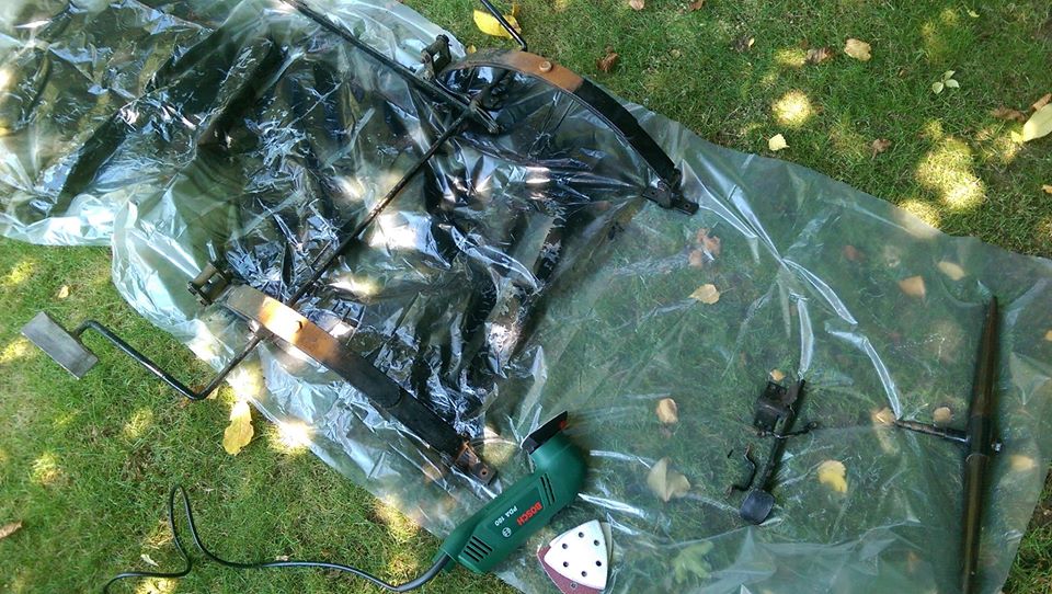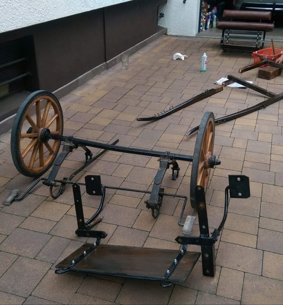 Wir zerlegen den gesamten Sulky. Die mit schwarzer Farbe zugekleisterten Metallteile, schliefen wir mit Deltaschleifern tagelang ab. Unter den Lackschichten konnte man erkennen, dass irgendwann einmal jemand in wunderschöner Handarbeit kleine Ornamente und Linien mit Goldfarbe aufgezeichnet hatte. Die Handarbeit war nicht zu retten! Die Farbe musste komplett ab!