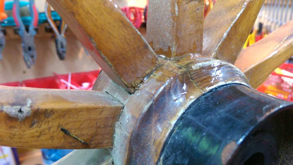Nachdem alles abgeschliffen war, klebten wir die Speichen in mühevoller Handarbeit mit Epoxidharz in die Narben ein.