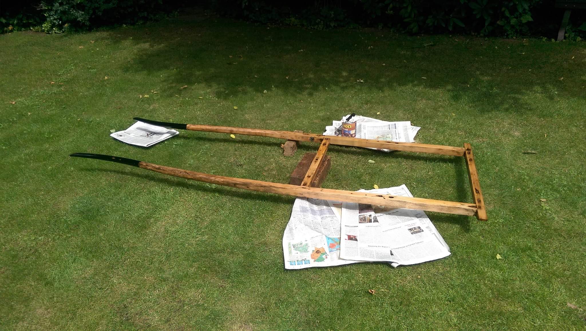 Während die Holzteile dann ein letztes Mal trockneten, sprühte ich die Metallteile wieder Mattschwarz an. Mein Vater sägte derweil neue Trittbrettchen zurecht, damit der Boden des Sulkys auch wieder stabil wurde und ich musste dann nochmal alle Brettchen streichen.
