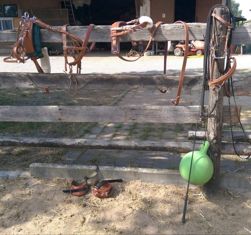 Wenn wir zu einer Ausfahrt aufbrechen, putze ich zunächst den Zwerg. Es wird dann das Geschirr geholt, aufgehangen und überprüft.