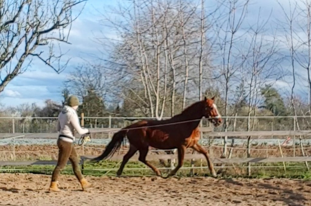 4. An der Longe zeigte sich, dass Dotaki noch ganz schön verspannt war. Wir arbeiteten fleißig und schnell wurde der Trab und auch der Galopp möglich. Ich ärgerte mich immer mehr, dass ich mich zu schnell auf den Ausbildungsstand, der vom Verkäufer angegeben war, verlassen habe.