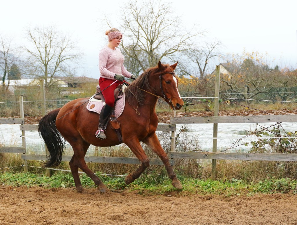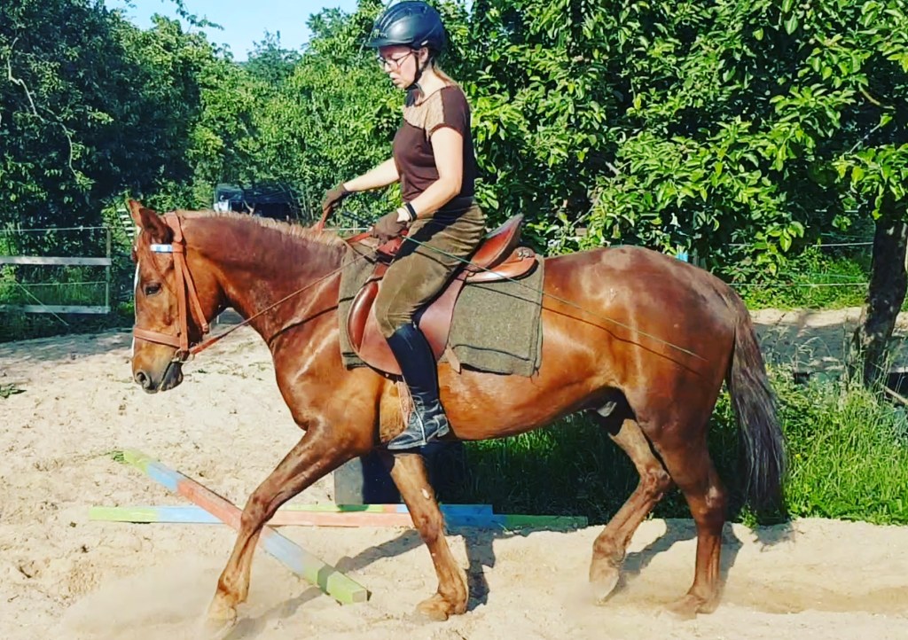 Es war dann ein ¾ Jahr nach dem Sturz endlich wieder möglich Dotaki weiter einzureiten. Zwar war ich ihn bei gefühlt 40 Grad Außentemperatur bei der Vorbesitzerin Schritt und Trab geritten, aber schon da hatte ich gemerkt, dass er nicht wirklich rund geht. Deshalb wollte ich langsam das Einreiten voran bringen, aber letztlich führte erst der Sturz dazu, dass ich wirklich 100% richtig die Ausbildung anfing.