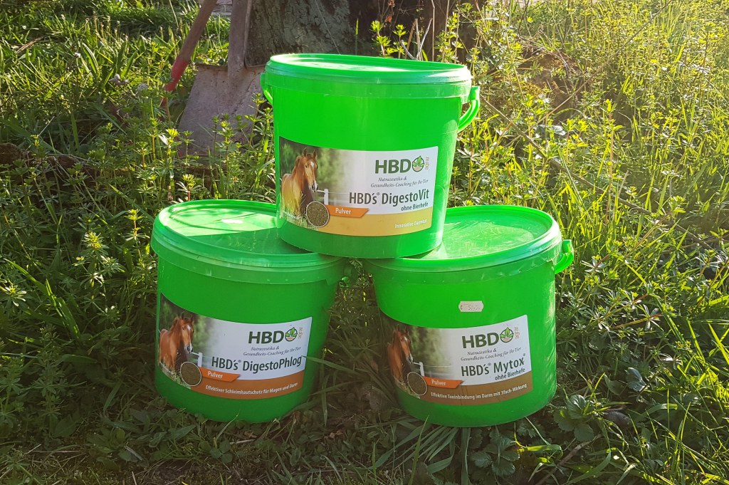 Um den Magen-Darm-Trakt wieder auf Vordermann zu bringen, empfehle ich die Produkte von HBD Agrar. So „speziell“ die Dame hinter diesen Produkten auch sein mag, genau so gut sind die Produkte für Pferde. Die organischen Stoffe im Futter sind besonders leicht vom Organismus zu verwerten und aufzunehmen und kommen besser im Pferd an, als billigere und anorganische Mittel anderer Hersteller.