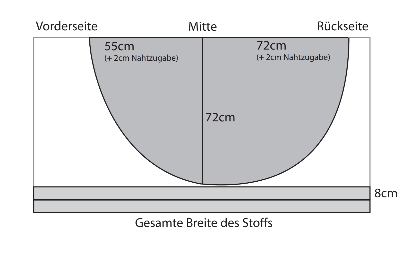 Je nachdem wie groß man ist, muss man die vordere und hintere Länge etwas anpassen und benötigt eine weniger breite, oder breitere Stoffbahn. In meinem Fall (Kleidergröße 36/38 bei 1,58m Größe), haben wir folgende Maße verwendet.