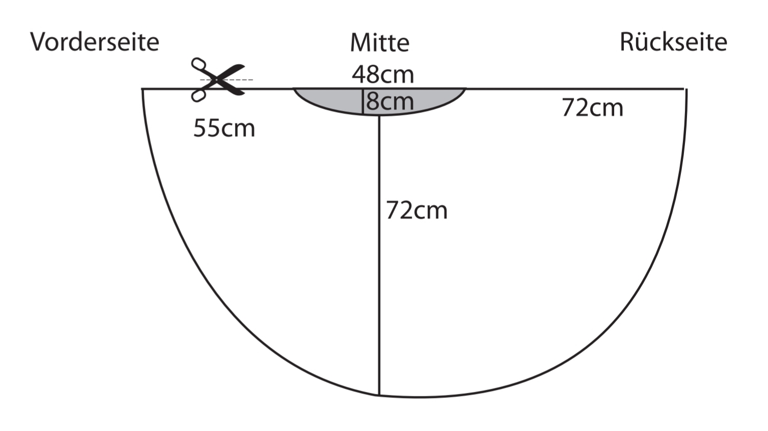 Nun schneidet ihr einen ca 8cm tiefen und 48cm (für größere Größen den eigenen Taillienumfang messen und halbieren) langen Halbkreis an der ehemaligen Stoffmitte heraus. Bedenkt, dass der Rock vorne kürzer ist als hinten. Hoffentlich habt ihr die Mitte des Ausgangstoffs zuvor gut markiert. Außerdem müsst ihr nun die Vorderseite des Rocks bis zum Halbkreis einschneiden.