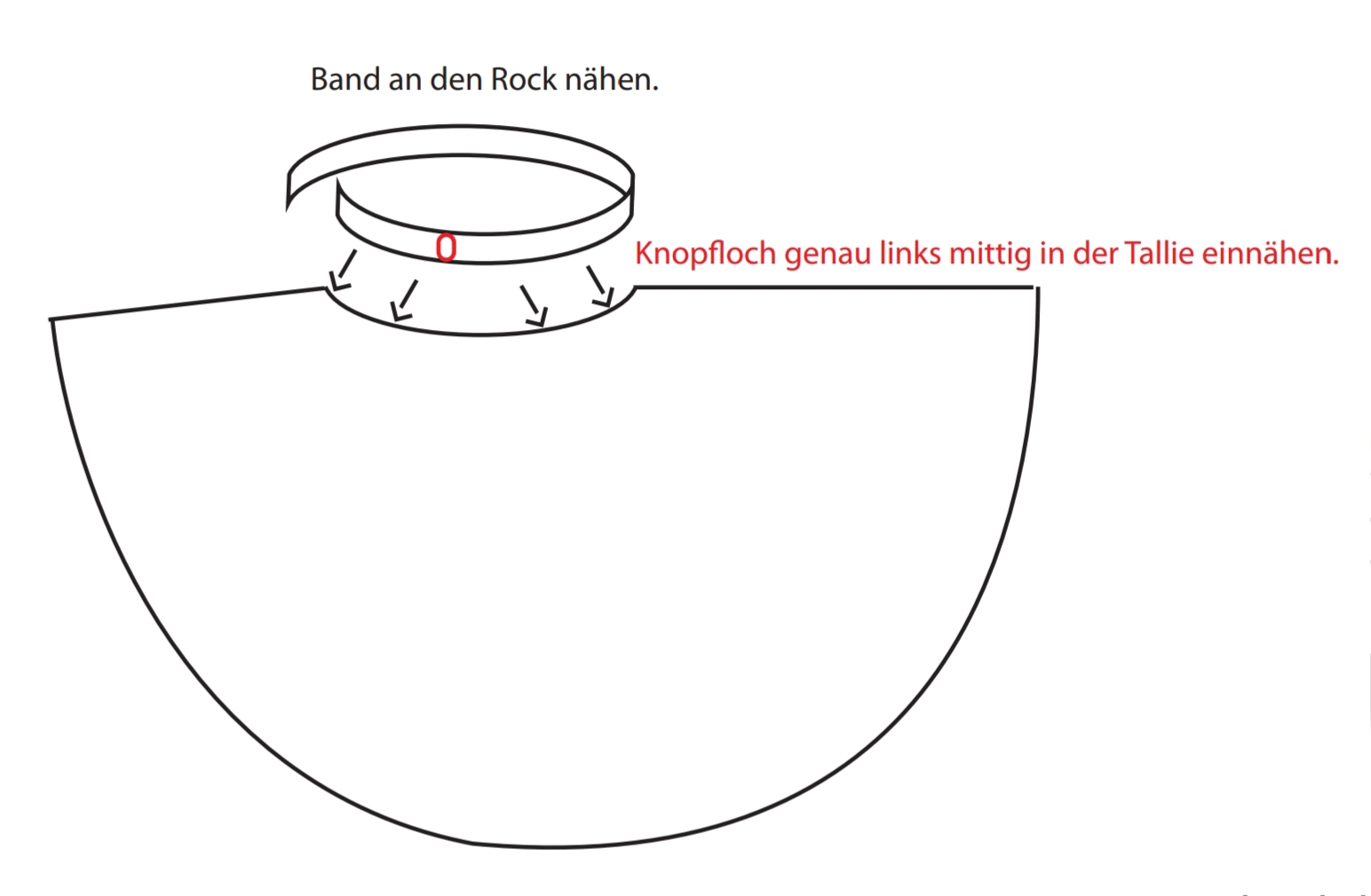 Das Band näht ihr nun an Euren Rock an. Probiert einfach etwas herum, wie die Länge für Euch am Besten passt. Genau seitlich, links mittig in der Tallie, näht ihr dann ein Knopfloch ein.