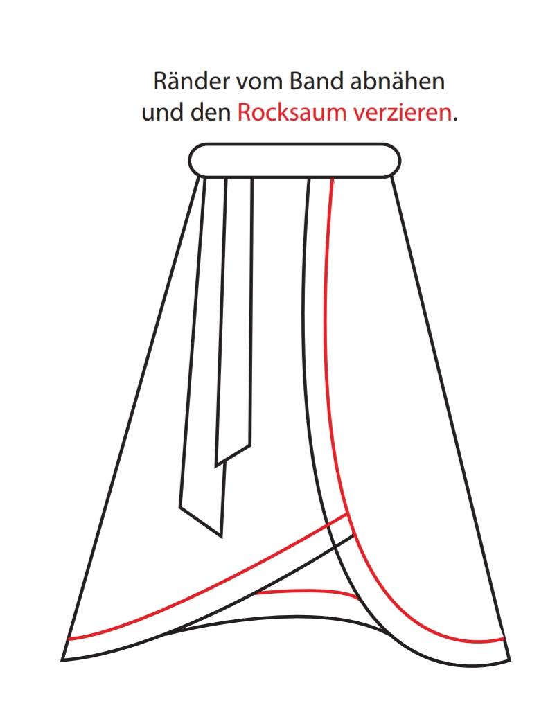 Wenn ihr nun das Band am Rock fixiert habt und alles soweit für euch passt, dann könnt ihr das Band noch sauber oben und unten ca 0,5cm umnähen und versäubern. Ebenfalls könnt ihr noch eine Borde am unteren Rand des Rocksaumes annähen.