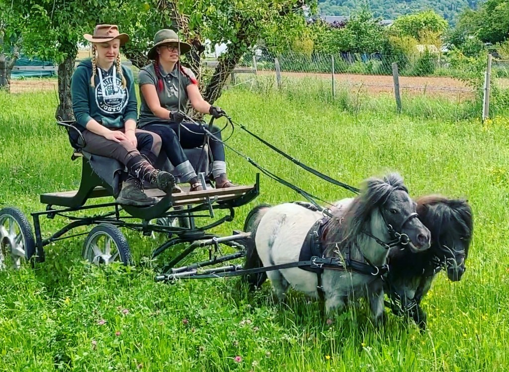 Während wir 2020 auf der Suche nach einem Minishettykumpel für unseren Minihengst waren, reifte schon damals die Idee, mit den zwei Minis dann zusammen an der Kutsche zu fahren. Rasenmäher sind unsere Zwerge nämlich nicht!