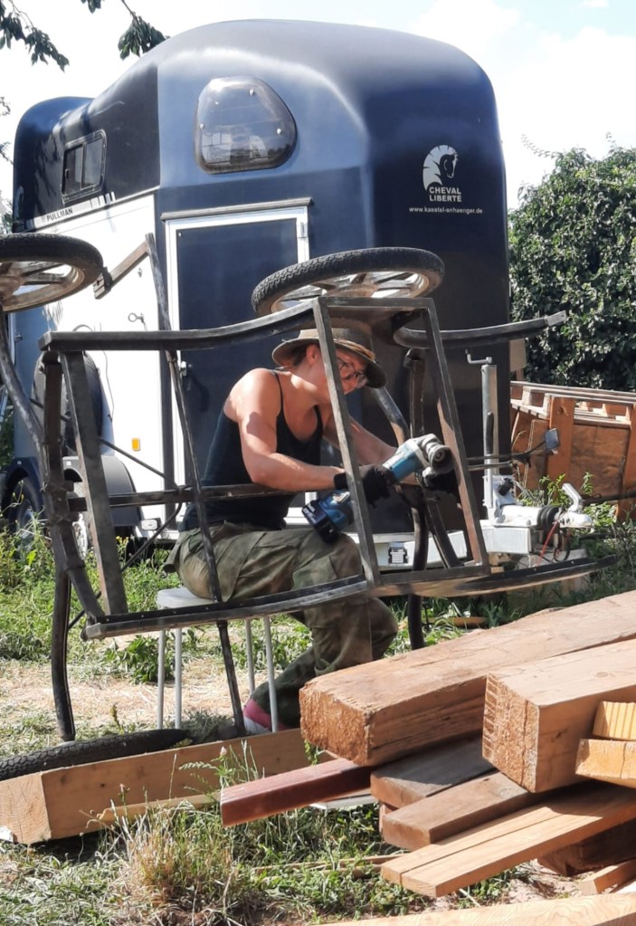 Die total verborgene Einspännerschere bauten wir ab und schweißten eine neue Aufnahme für eine Zweispännerdeichsel. Von einer Bekannten bekamen wir eine super ramponiert, aber preiswerte Zweispännerdeichsel inklusive Spielwaage in Ponygröße. Aus den diversen verborgenen Metallrohren bauten wir dann nach Maß eine Deichsel mit Sprengwaage, da das Fahren auf komplett loser Anspannung mit Spielwaage zumeist nur in der Forst- und Landwirtschaft genutzt wird.