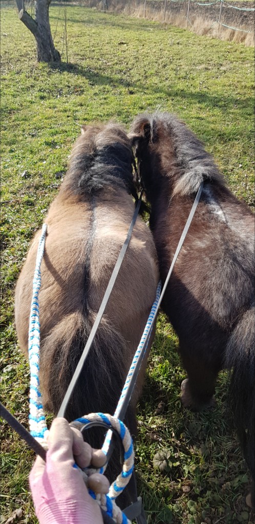 Nachdem Eddie am Boden ohne Probleme zu fahren war, begann die Arbeit mit beiden Pferden zusammen. Zunächst übten wir ohne Geschirr und die Ponys liefen erst einmal nur nebeneinander her, während ich Anhalten, Losgehen und Seitwärts, sowie Rückwärts abfragte.