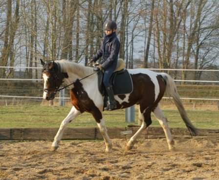 Auch diese Aufnahme eignet sich sehr gut für eine Verkaufsanzeige eines gerittenen Pferdes. Die Trabphase ist gestreckt, zeigt den maximalen momentanen Raumgriff und gibt ein reelles Bild über das momentane Reitniveau. Man kann erkennen, dass dieses Pferd in den Beinpaaren ungleich tritt. Die Hinterbeine laufen in einem kleineren Bewegungsmaß, wie die Vorderbeine, tragen also weniger Last. Daraus ergibt sich auch die geringe Taktverschiebung. Beachtet man jedoch, dass das Pferd hier von einem Kind präsentiert wird, kann man davon ausgehen, dass ein guter Reiter dieses Pferd einfach und gut taktrein geritten bekommt. Ebenfalls bietet sich das Pferd sehr gut an, tritt an die Hand heran und streckt sich ins Gebiss ab. Bei verbesserter Lastaufnahme, wird der Schecke seine Schulter noch etwas besser anheben können und die Anomalie vorm Wiederrist verschwindet. Ein nettes Pferdchen, das auch von Anfängern zu reiten ist (wenn das Interieur stimmig ist).