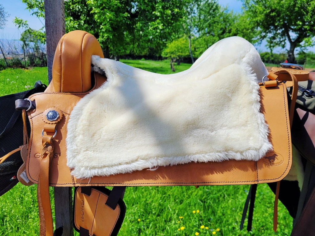 Ein weiteres großes Minus stellen die original GHOST Pads dar, auf welche ich folgend eingehen möchte. Ich habe leider mittlerweile keine guten Erfahrungen mit den GHOST Pads machen müssen. Gerade bei Pferden mit viel Rist, zieht sich das Pad für gewöhnlich so schief hin, dass das Sattelkissen auf den Rand der Padpolstereinlage drückt und nebst Haarbruch super unangenehme und offene Scheuerstellen verursacht. Die Verarbeitung der Pads oberhalb der Wirbelsäule macht es schwer das Pad am Rist angenehm auszurichten. Das Standardmaterial der Unterseite „Sympanova“ rutscht bei vielen Pferden, oder verursacht Haarbruch. Eine Baumwollunterseite oder Lammfell haben sich deutlich mehr bewährt wohingegen die Schurwolleunterseiten leider ziemlich schnell ausfransen und die Wollfasern verlieren. Im Großen und Ganzen habe ich von den GHOST Pads nach langer Testphase Abstand genommen und bin auf andere Pads mit Polsterung umgestiegen. Die Polsterplatten die GHOST verbaut funktionieren in Kombination mit dem alten GHOST System in punkto Druckverteilung und WSF einwandfrei, nur leider taugt der Padschnitt nichts. Andere Hersteller passen hier deutlich besser unter das Sattelsystem und supporten Passform und Wirkung optimal. Wichtig ist auch zu wissen, dass ich es nicht empfehlen kann die GHOST Sättel komplett ohne Polsterunterlage zu reiten. Dafür ist das normale Basissystem bereits zu flexibel und benötigt trotz des ausgeklügelten Systems die Durckverteilendewirkung durch das Pad!