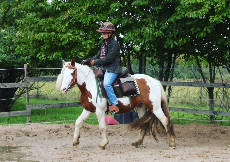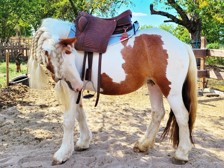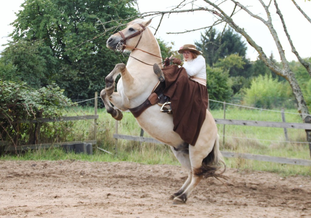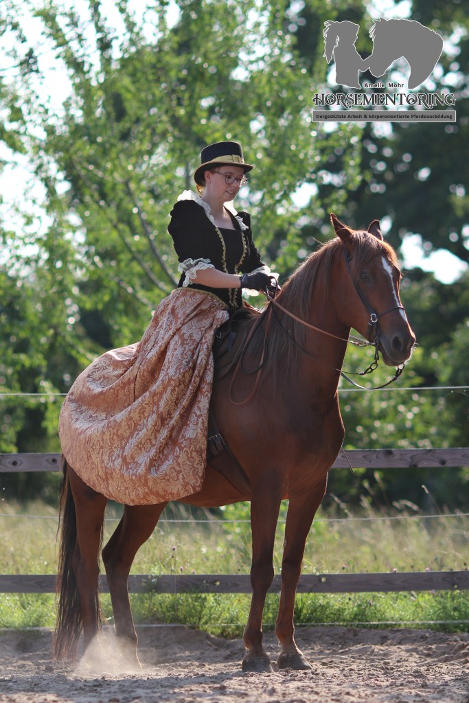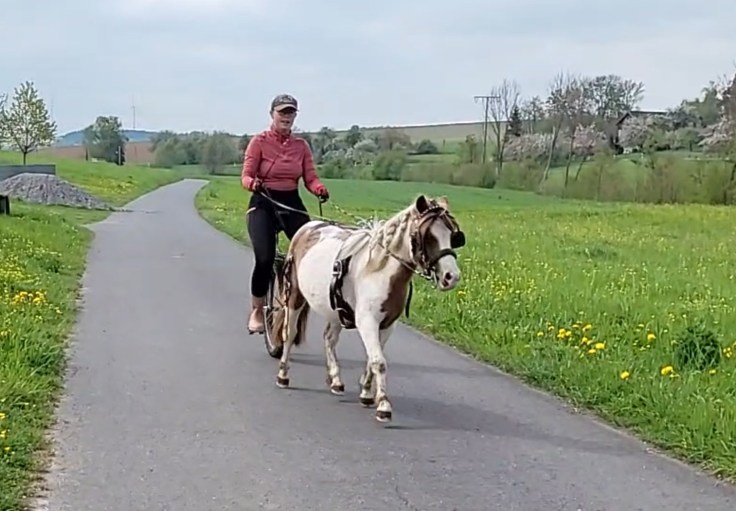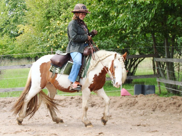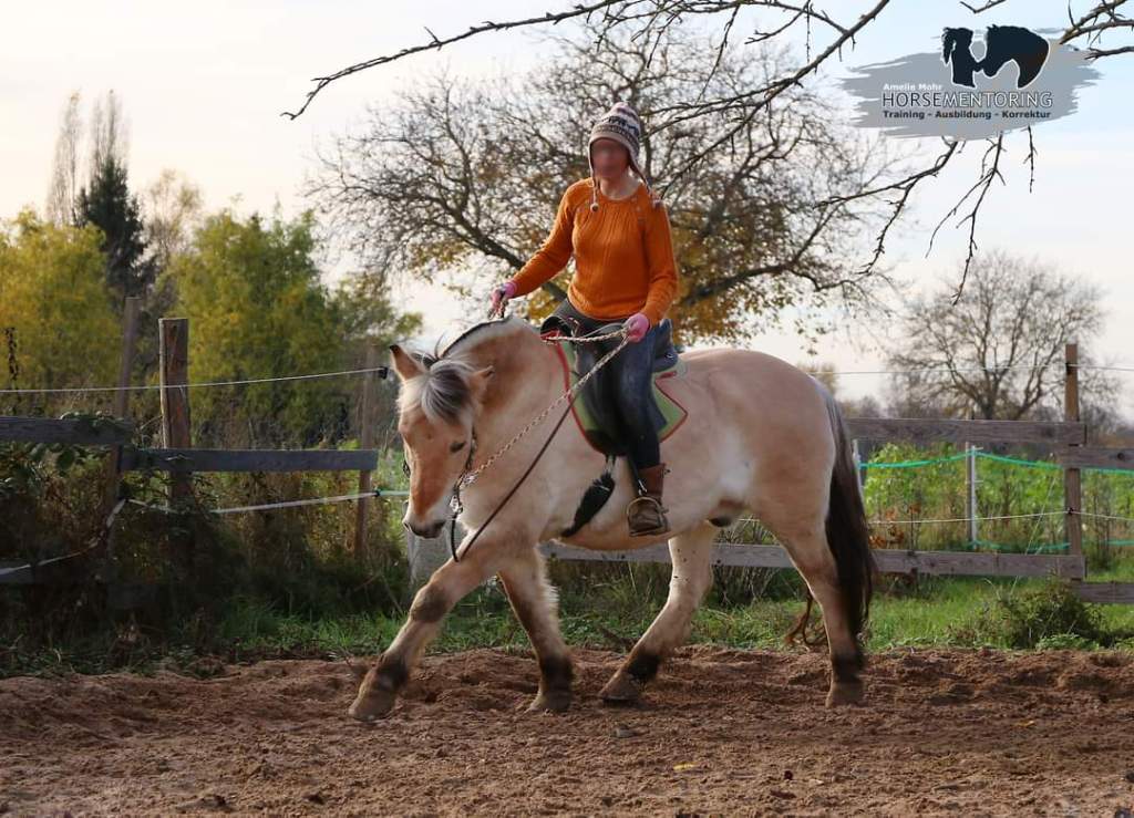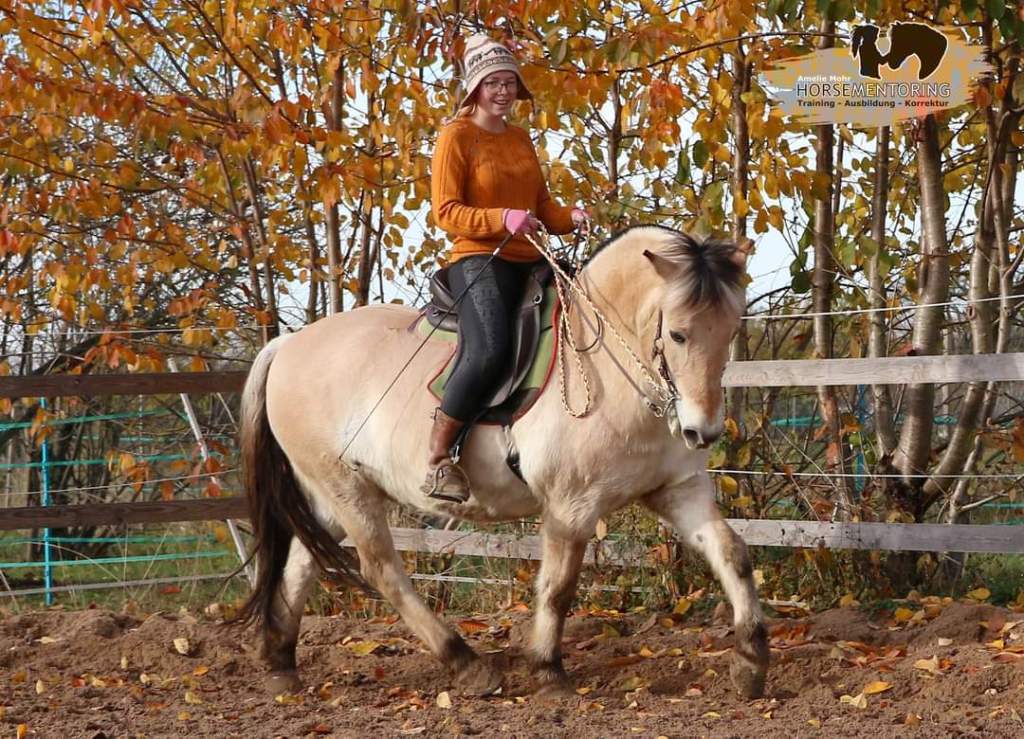 Mit viel Ruhe und durch kleinschrittiges Training fasste die nur 1,30m kleine Tinkerstute schnell Vertrauen und öffnete sich der großen Welt des Lernens. Mittlerweile ist sie bereits solide angeritten. Sie beherrscht einige Zirkustricks und ist sehr zuverlässig im Alltag geworden. Schmied, verladen, Spazieren gehen, nichts schockt sie mehr. Merida ist sehr gut eingefahren und läuft artig im Gelände und auf dem Platz. Sie hat ein absolutes Herz aus Gold und verzaubert jeden mit ihrer grunderlichen und lieben Wesensart.