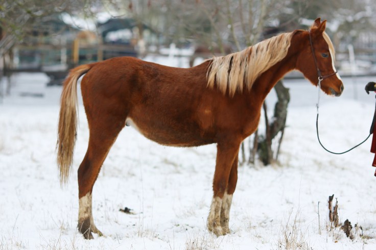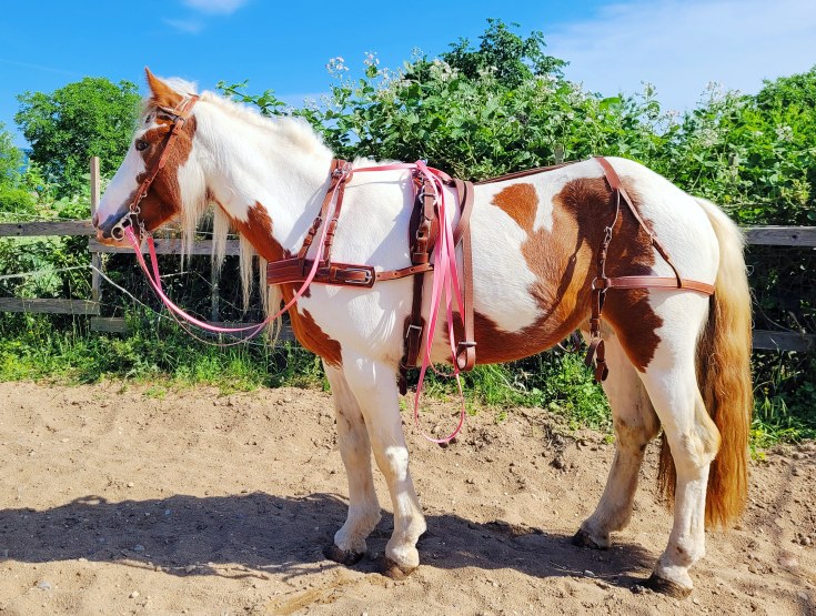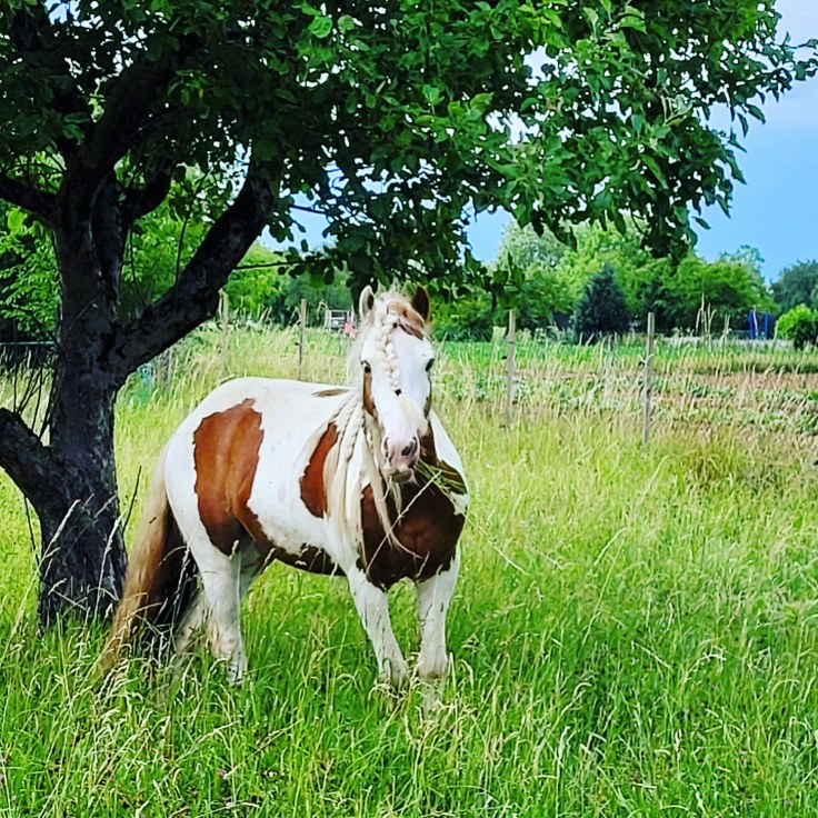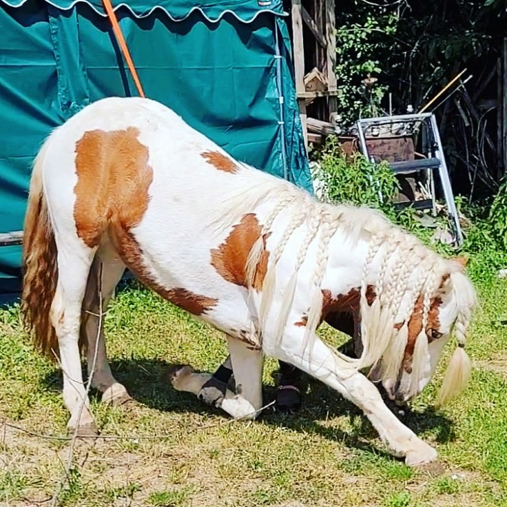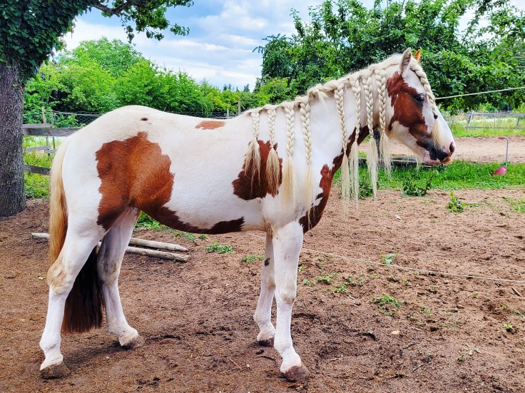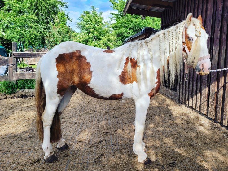 Morgana war 2 Jahre Teil unseres Teams. Sie kam aus dem privaten Tierschutzsektor und hatte eine heftige Durchtrittigkeit durch einen Weidezaununfall als Fohlen am hinteren linken Fuß. Wir konnten in Kooperation mit dem Tierarzt, der Physio und der Hufbearbeiterin große Fortschritte erziehlen und die junge Stute erlange so viel Lebensfreude, dass wir sie vorsichtig vor der Kutsche anfingen zu arbeiten. Auf ebenem Gelände in Schritt und Trab gefördert, zog Morgana Anfang 2024 in ein schönes zu Hause bei 2 kleineren Mädchen. Dort wird sie als Zweitpony geliebt und getüddelt und wird ganz selten auch mal etwas ausgefahren.